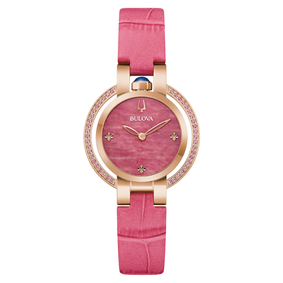 La línea Rubaiyat de Bulova, con su característica corona en la parte superior de la caja, forma parte de la colección de relojes femeninos desde 1917. La serie Four Seasons se lanzó para conmemorar el 150 aniversario de Citizen y abarca todo el año del aniversario en relojes que simbolizan las cuatro estaciones: “Spring” captura la esencia de la estación de la floración con una esfera rosa y 42 zafiros rosas, con un total de 25 quilates. La esfera rosa está elaborada con rodonita rosa natural, lo que garantiza que cada esfera sea única. La rodonita se asocia con el amor y favorece la curación emocional. La esfera está decorada con marcadores en forma de flor. Este lujoso reloj para mujer se entrega con un embalaje especial de Rubaiyat, que incluye un libro de cuentos.