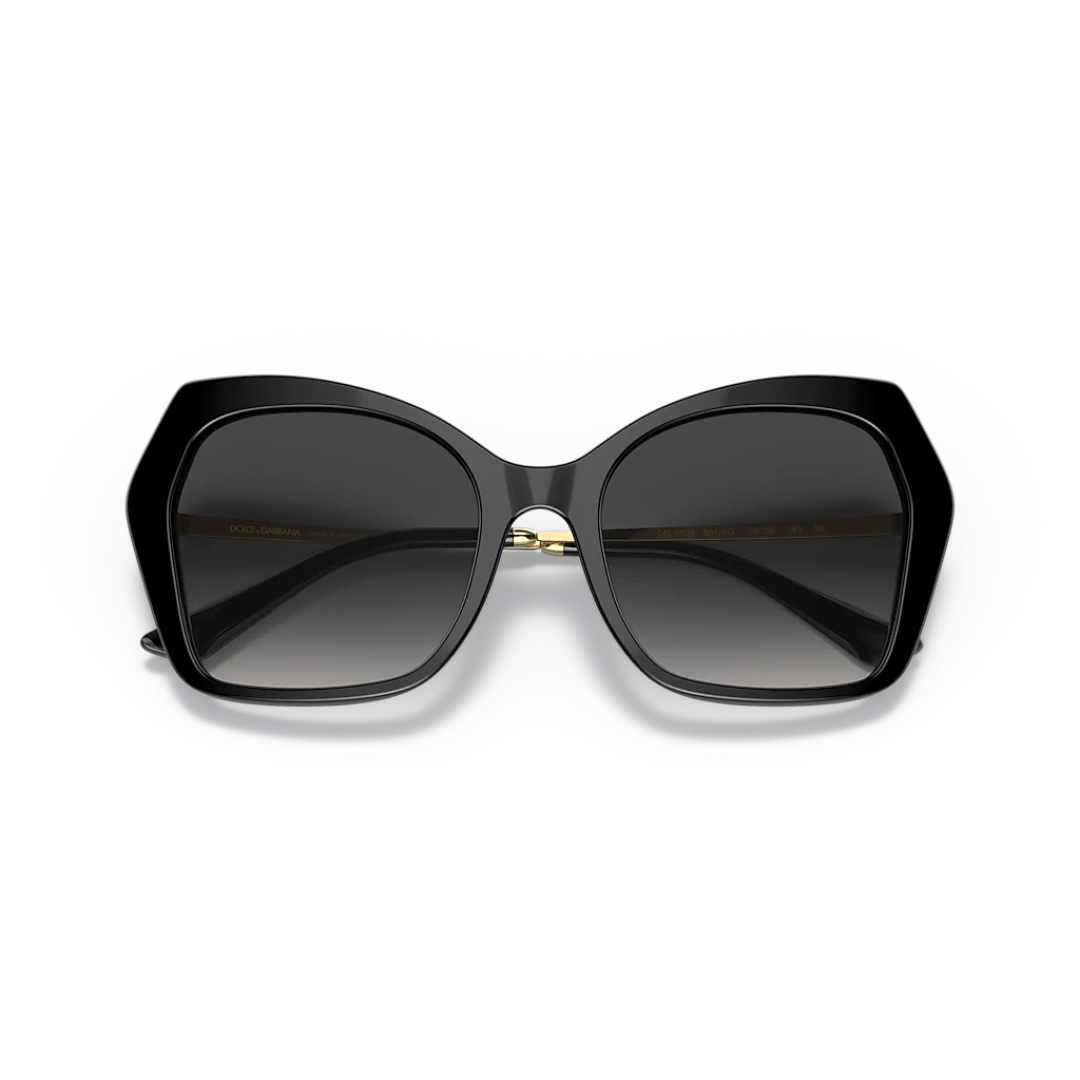 Gafas de sol para mujer con un diseño cuadrado y contemporáneo de acetato negro brillante. Cuentan con un detalle distintivo de eslabón de cadena metálica en las patillas, que les otorga un toque de joyería de lujo, y lentes grises degradadas.