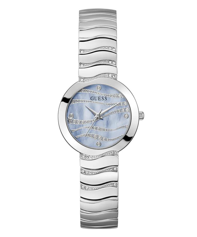El GUESS GW0871L1, de la colección Nova, es un reloj analógico para mujer que destaca por su diseño minimalista y moderno. Presenta una caja redonda de acero inoxidable pulido y un brazalete de eslabones tipo malla milanesa a juego, ambos en un tono plateado monocromático. Su esfera blanca, con un sutil acabado de rayos de sol e índices de bastón minimalistas, le confiere un aspecto limpio y sofisticado. Es un accesorio ligero y elegante, ideal para el uso diario y para añadir un toque de estilo contemporáneo a cualquier conjunto.