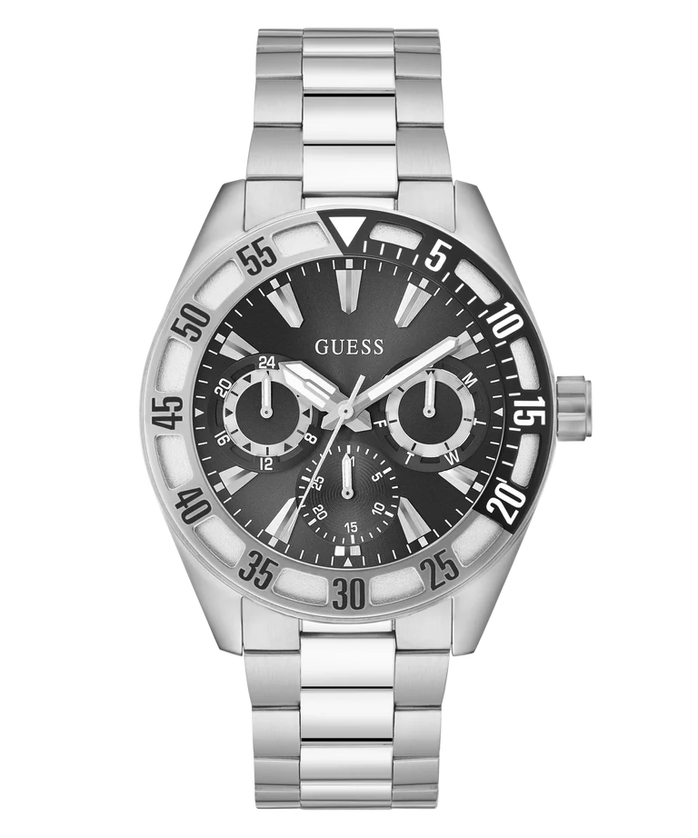 El GUESS GW0904G1, de la colección Letterman, es un reloj multifunción para hombre que equilibra un diseño clásico con una estética deportiva de inspiración “Ivy League”. Presenta una caja y un brazalete de eslabones de acero inoxidable (algunas fuentes mencionan acero reciclado) en un tono plateado pulido y cepillado. La esfera negra, con un acabado de rayos de sol o una textura sutil, cuenta con tres subesferas funcionales que añaden un toque de sofisticación técnica y un rendimiento confiable para el uso diario. Es un accesorio versátil, ideal para el uso diario y para añadir un toque de elegancia casual a cualquier conjunto.