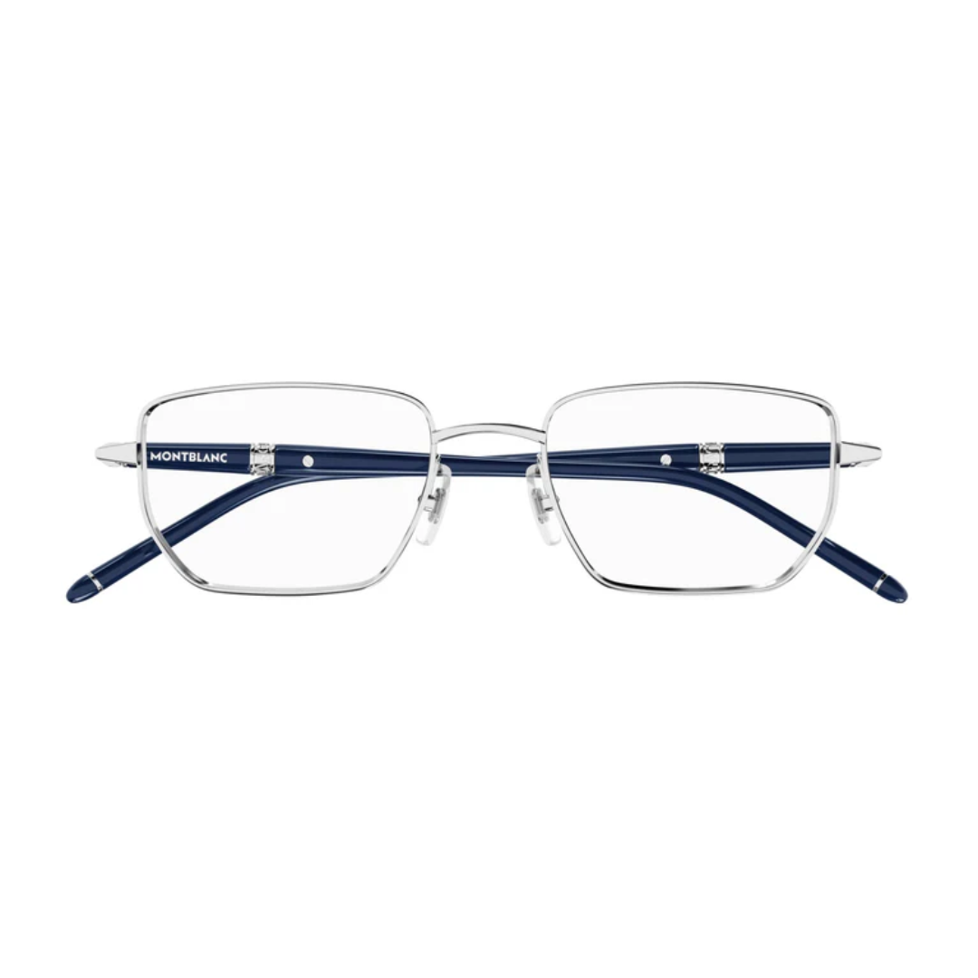 Marco de anteojos oftálmicos para hombre con un diseño rectangular y estilo de montura completa. El marco es de metal en tono plateado, con detalles en azul en las varillas, ofreciendo un estilo minimalista, sofisticado y de alta calidad, inspirado en los icónicos instrumentos de escritura Meisterstück de Montblanc.