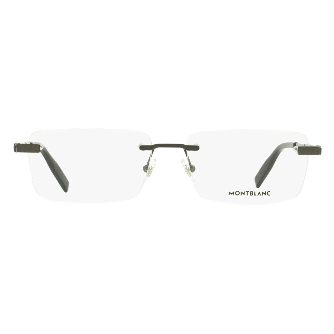 Marco de anteojos oftálmicos para hombre con un diseño rectangular refinado y estilo “rimless” (al aire). La montura de metal ultraligero en tono rutenio (gris oscuro) ofrece un estilo minimalista, sofisticado y de alta calidad, con detalles grabados inspirados en los instrumentos de escritura Meisterstück de Montblanc.