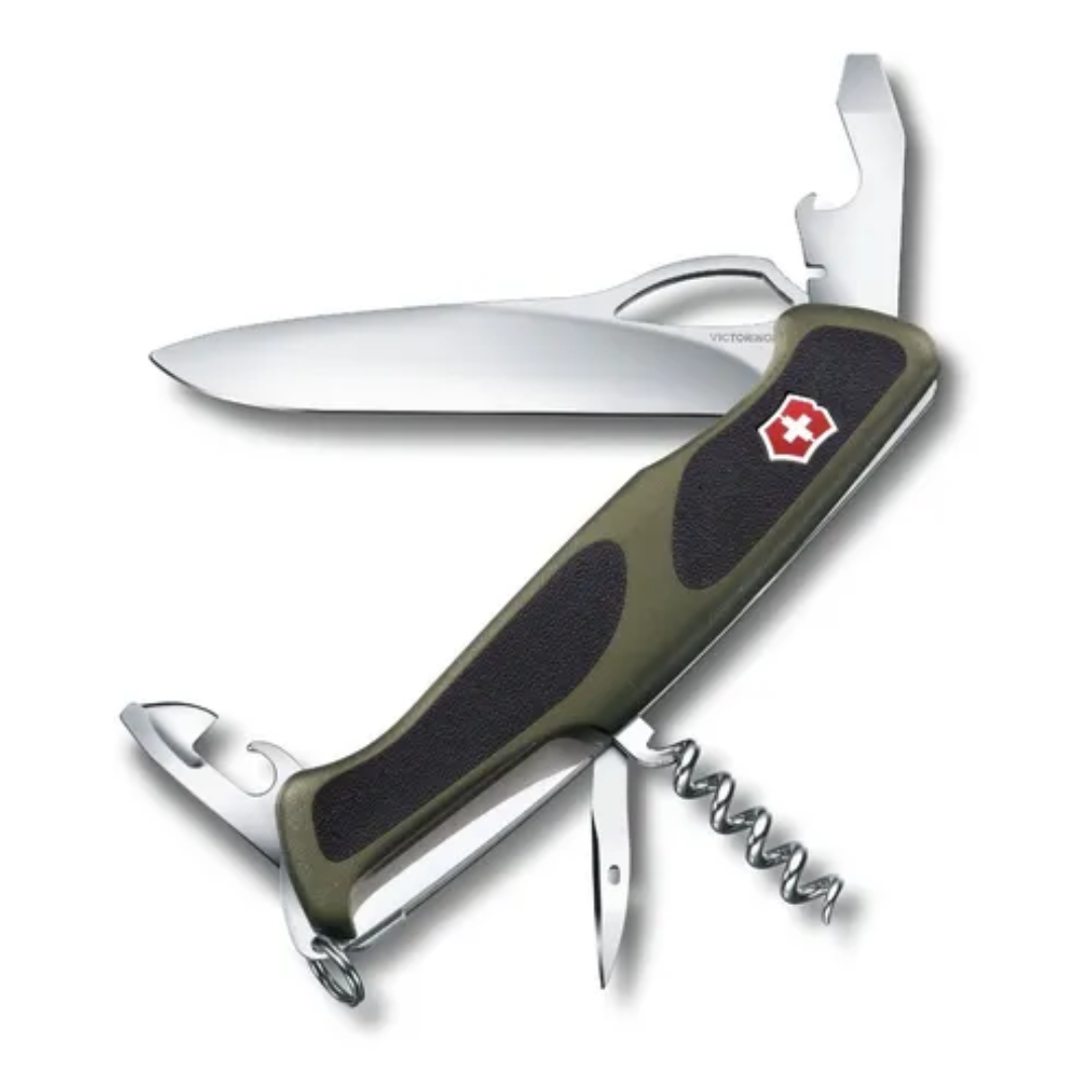 La Ranger Grip 55 es una navaja suiza de la serie Delemont, diseñada para usuarios que requieren herramientas robustas y un agarre superior. Sus cachas ergonómicas bicomponente en verde oliva y negro, con inserciones de caucho, garantizan un manejo seguro incluso en condiciones húmedas o con guantes. La hoja principal es más grande (111 mm) y cuenta con apertura para una sola mano y un sólido sistema de bloqueo, ideal para tareas de campo, caza o rescate.
