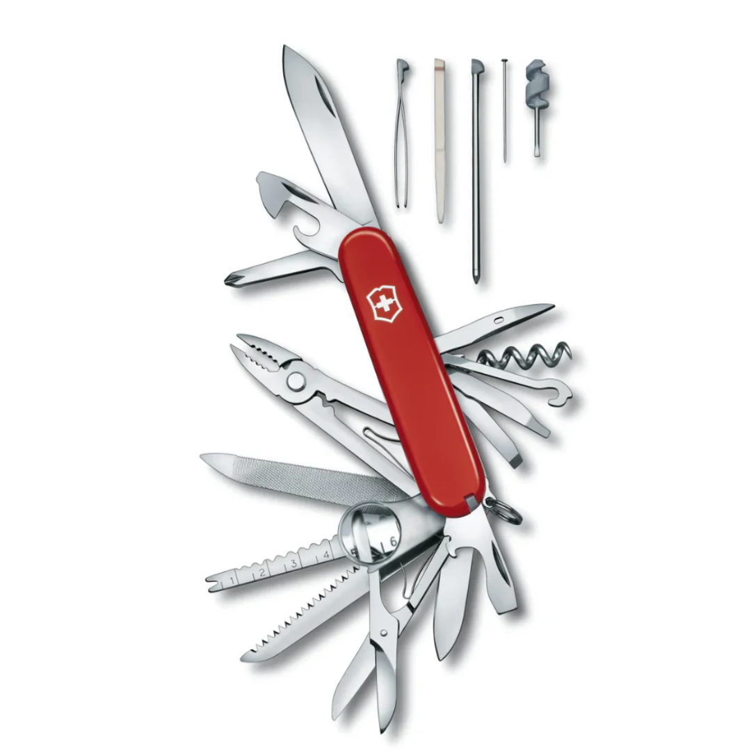 La SwissChamp es el emblema de la versatilidad compacta, diseñada para ofrecer una solución inmediata ante cualquier desafío en la naturaleza, el hogar o la ciudad. Su cuerpo de ABS/Cellidor rojo icónico alberga 33 funciones integradas con una precisión quirúrgica, proporcionando una sensación de robustez y equilibrio inigualable en la mano. Fabricada con acero inoxidable de alto rendimiento, esta navaja no es solo una herramienta, sino una leyenda del diseño industrial pensada para durar generaciones.