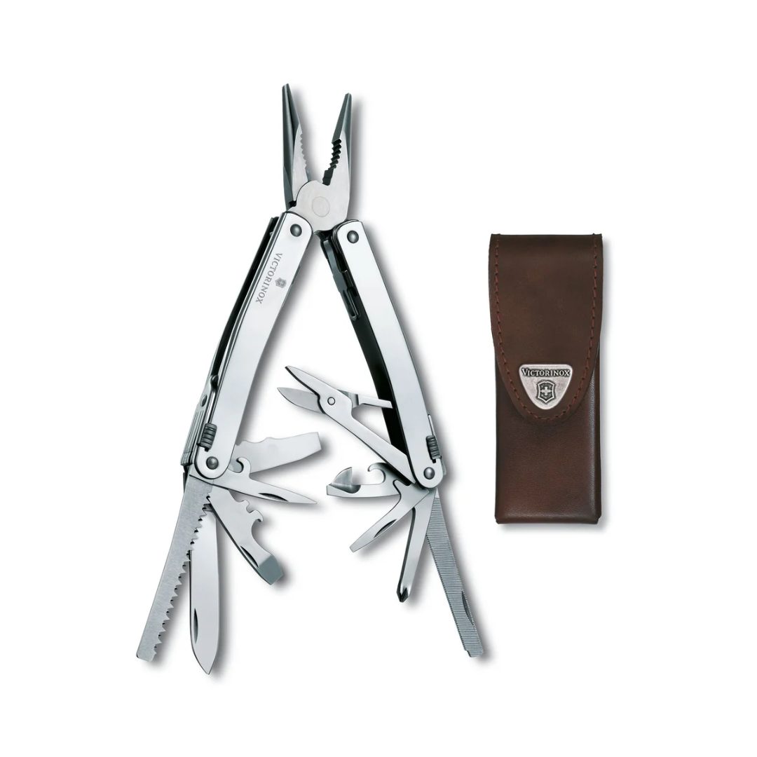 La SwissTool X Plus es una multiherramienta de tipo alicate de alta gama, diseñada para superar a cualquier competidor en términos de precisión, funcionalidad y durabilidad. Fabricada íntegramente en acero inoxidable de alta calidad, sus 37 funciones están accesibles desde el exterior y se bloquean de forma segura. Este set incluye herramientas adicionales como un extensor de puntas y una llave de carraca, todo presentado en una funda de cuero premium para un transporte seguro. Es la navaja suiza llevada al extremo de la utilidad industrial.