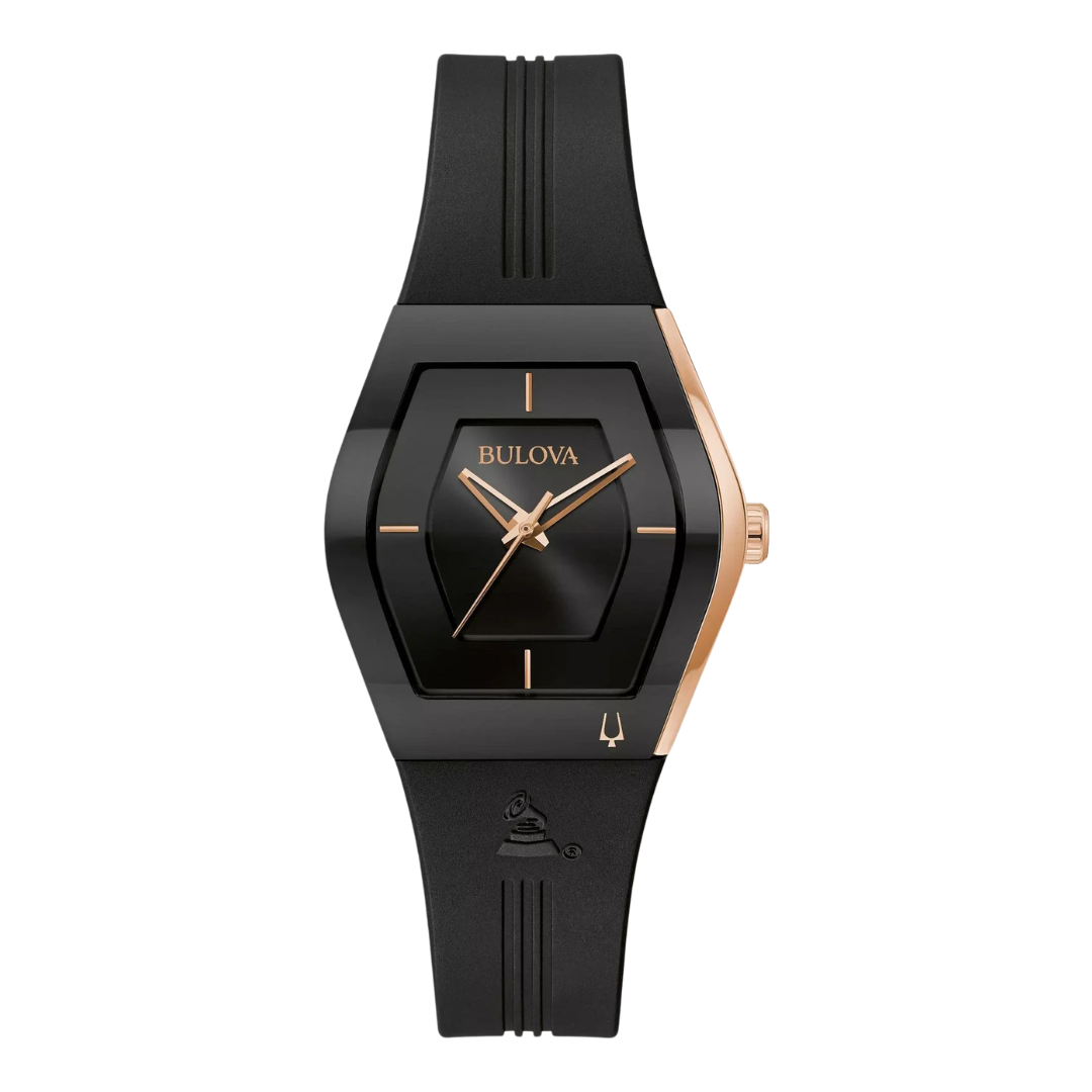 Como socio oficial de relojes de The Latin GRAMMYs®, Bulova ha creado el Latin GRAMMY® Gemini, un nuevo diseño curvo tipo tonel. La distintiva caja asimétrica de acero inoxidable en tono oro rosa con un cristal negro metalizado curvado de borde a borde Futuro característico presenta una esfera negra con detalles en tono oro rosa. La correa de silicona negra presenta el icónico logotipo de Latin GRAMMY® en el frente, así como en la parte posterior de la caja que muestra el logotipo de color platino para conmemorar la 21.a Entrega Anual del Latin GRAMMY®. El reloj cuenta con un movimiento de cuarzo de tres manecillas, hebilla desplegable con pulsadores y resistencia al agua hasta 30 metros.