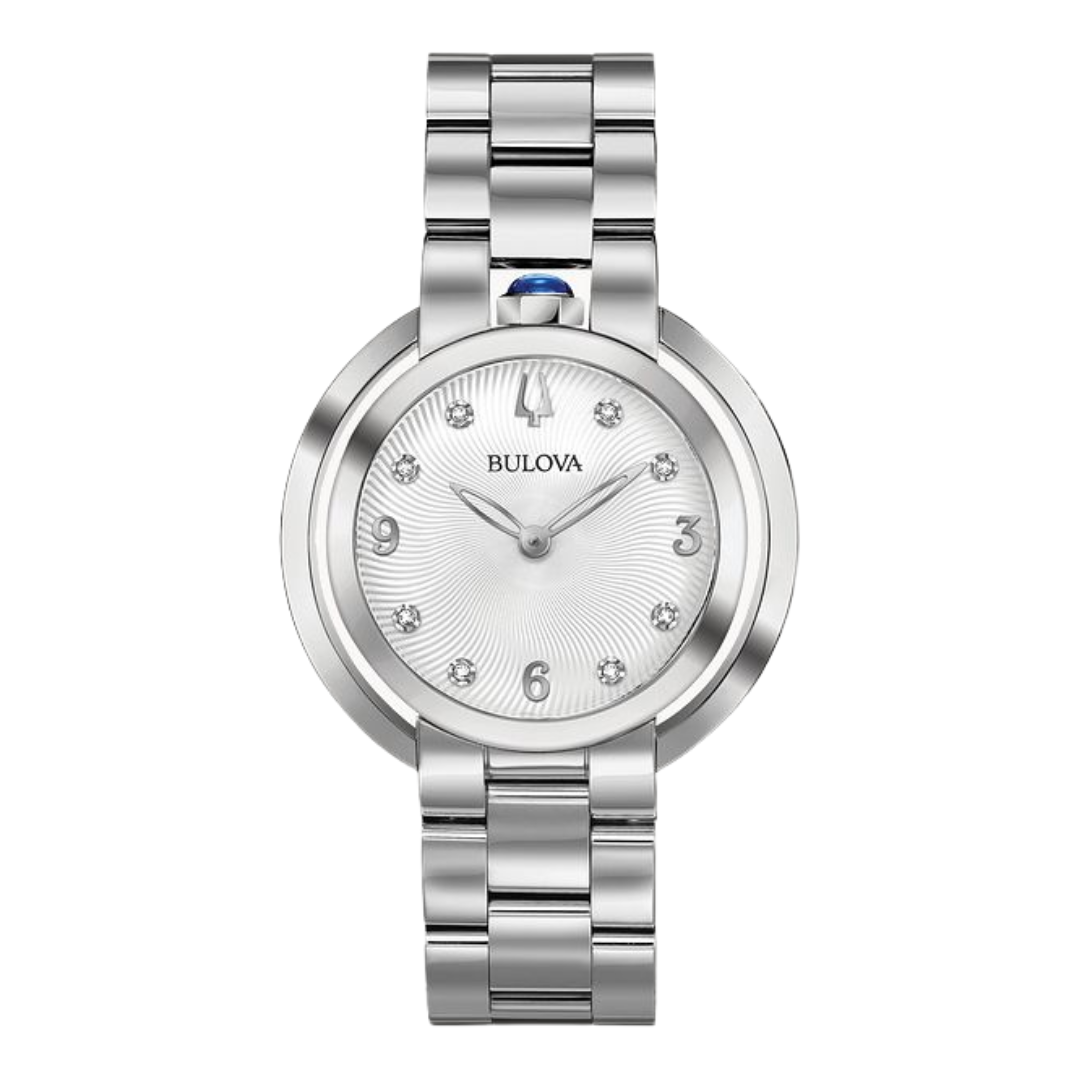 De la colección Rubaiyat. Herencia legendaria reinventada en caja de acero inoxidable con corona de cabujón de espinela azul sintética en la posición de las 12 en punto y ocho diamantes engastados individualmente a mano en esfera blanca plateada texturizada, cristal de zafiro de doble curvatura, brazalete de acero inoxidable con cierre desplegable de doble presión, tinte icónico golpeado Fondo de caja dimensional “Goddess of Time” y resistencia al agua hasta 30 metros.