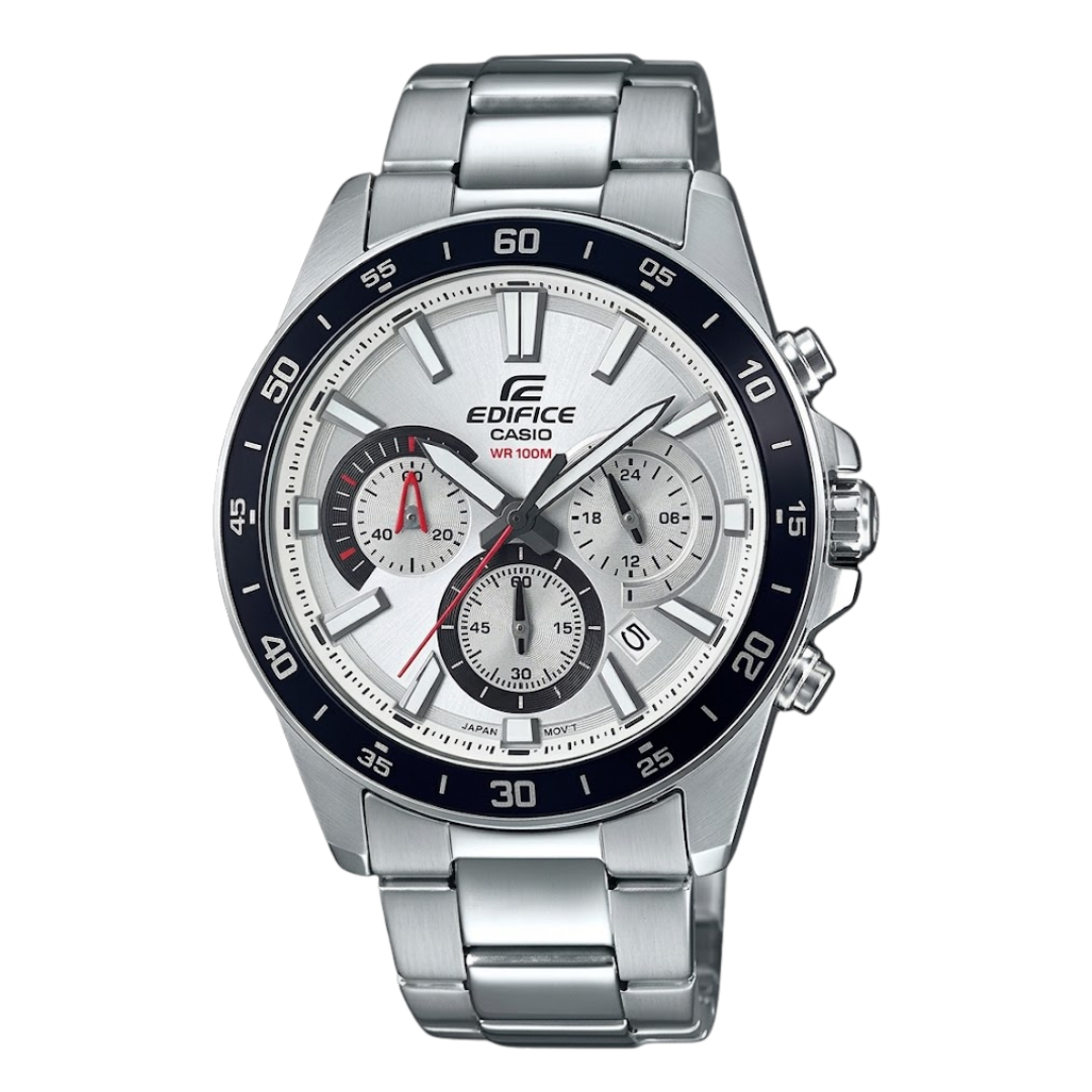 El Casio Edifice EFV-570D-7AVUDF es un cronógrafo que destaca por su estética limpia, luminosa y altamente profesional. Este modelo presenta una sofisticada esfera de color plateado/blanco con un acabado cepillado que le otorga una apariencia de lujo técnico. Su diseño se caracteriza por una organización simétrica de sus tres subesferas y un bisel delgado que maximiza la apertura de la esfera, facilitando la lectura. Con su construcción íntegra en acero inoxidable y un tamaño de caja equilibrado, es el accesorio perfecto para el hombre que busca un estilo “Sport-Elegant” versátil, ideal tanto para el uso ejecutivo como para ocasiones casuales refinadas.