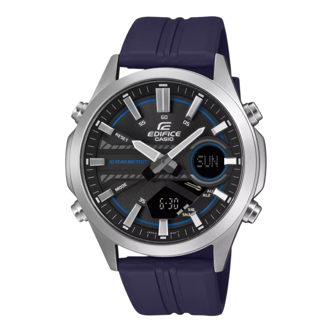 El Casio Edifice EFV-C120P-1A2DF es una pieza que proyecta un estilo técnico y dinámico, fusionando la sofisticación de un cronógrafo analógico con la versatilidad de la tecnología digital. Este modelo destaca por su correa de resina negra, que le otorga un aire deportivo y mayor comodidad para el uso activo, en contraste con su robusta caja de acero inoxidable. Su esfera negra presenta detalles en un vibrante azul cian, acentuando su estética moderna inspirada en los tableros de competición. Además de su diseño de alto impacto, ofrece funcionalidades avanzadas como hora mundial y una excepcional batería de 10 años, consolidándose como un accesorio de alto rendimiento para el hombre contemporáneo.