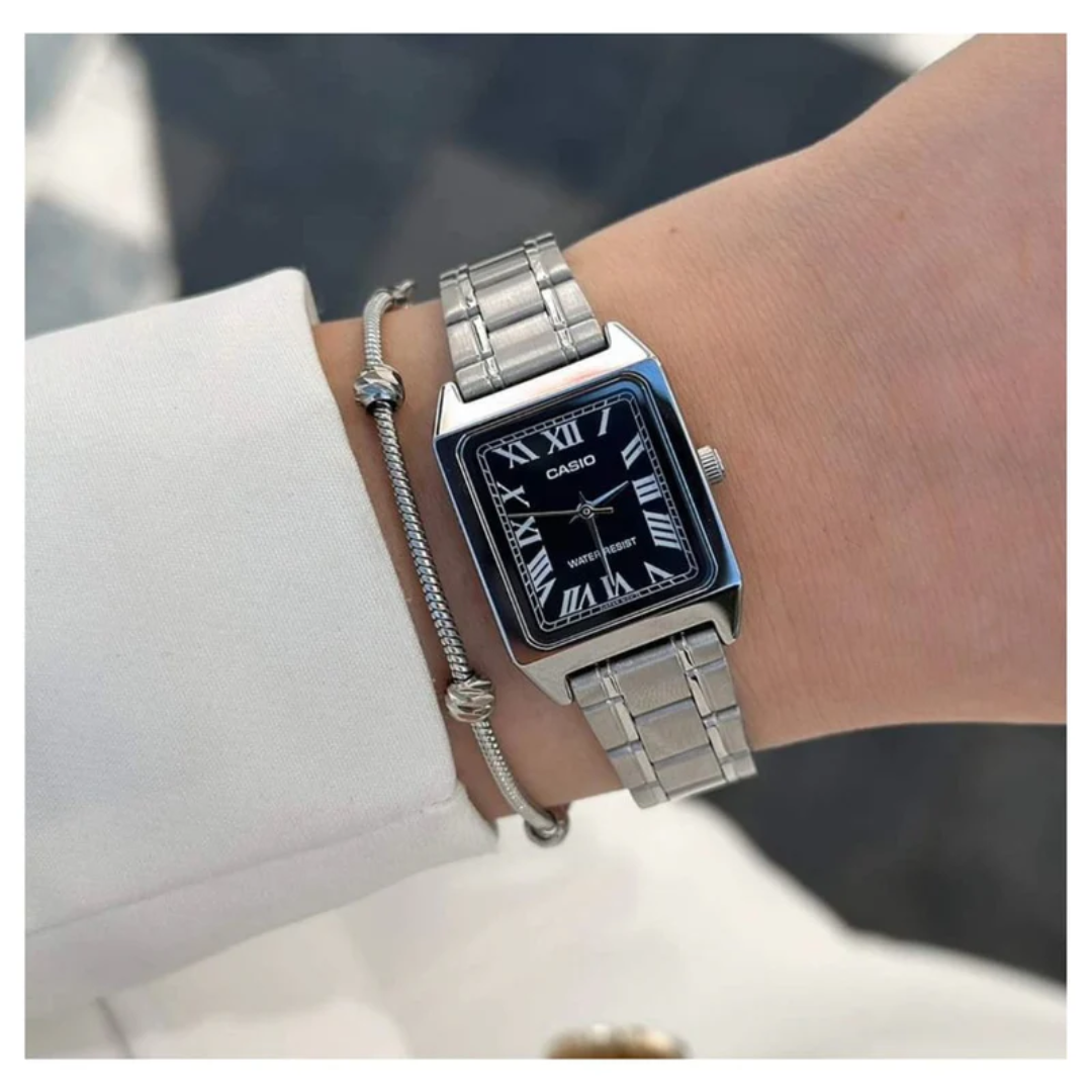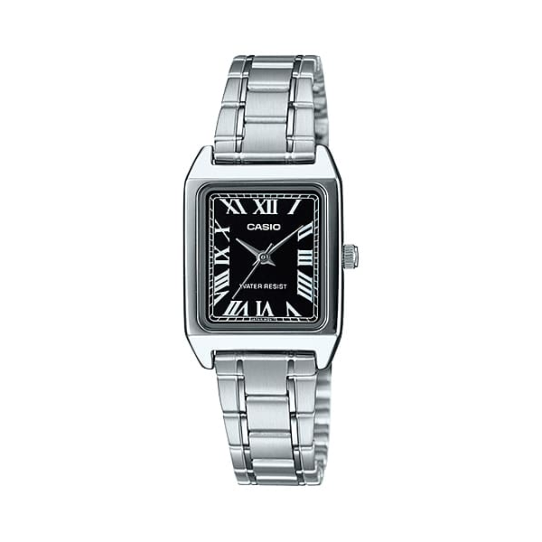 El Casio LTP-V007D-1BUDF es un reloj de pulsera para mujer que destaca por su diseño minimalista, elegante y su clásica forma rectangular. Este modelo ofrece una estética discreta y sofisticada con una caja plateada y una esfera negra de fácil lectura, que incluye una útil visualización de la fecha. Su construcción en acero inoxidable para la caja y la correa garantiza durabilidad y un acabado pulido y atemporal, ideal para el uso diario o para complementar atuendos de oficina y ocasiones formales.