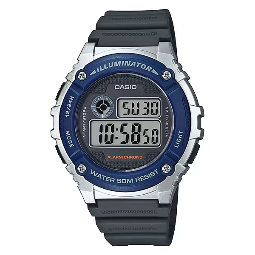 El Casio W-216H-2AVDF es un reloj digital deportivo, ligero y funcional, diseñado para el uso diario y actividades al aire libre. Cuenta con una robusta caja de resina negra y un distintivo bisel superior azul, que le otorga un aspecto moderno y dinámico. A pesar de su diseño accesible, ofrece características prácticas como cronómetro, alarma, luz LED y una impresionante duración de batería de aproximadamente 7 años, combinando resistencia y practicidad en un formato cómodo y fácil de leer.