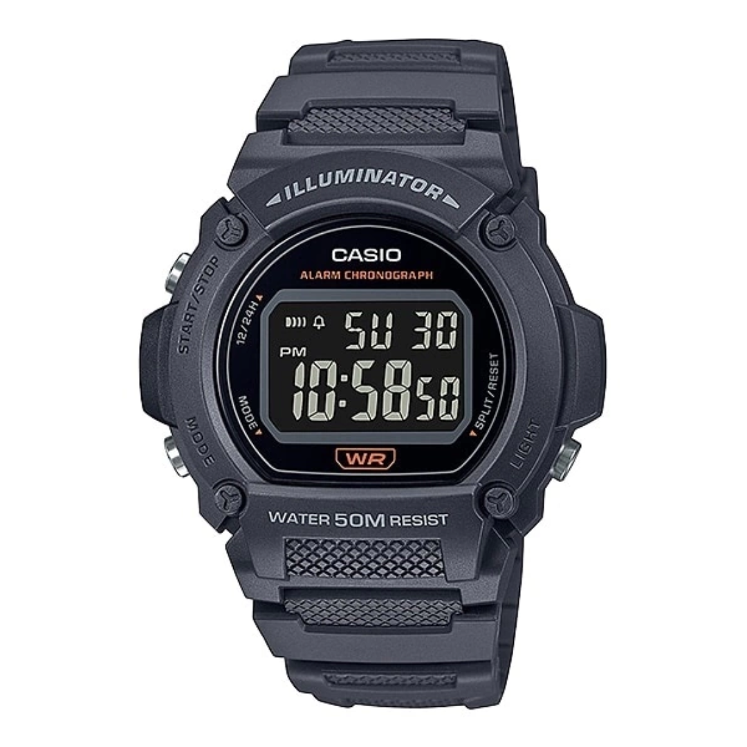 El Casio W-219H-8BVDF es un reloj digital de estilo deportivo y robusto, diseñado para quienes buscan durabilidad y funcionalidad en un formato de gran visibilidad. Este modelo destaca por su caja y correa de resina en un versátil color gris, con detalles en la carátula que refuerzan su estética técnica y moderna. Su diseño está pensado para el uso rudo y actividades al aire libre, ofreciendo herramientas esenciales como cronómetro, alarma y una potente luz LED, respaldadas por una batería de larga duración.