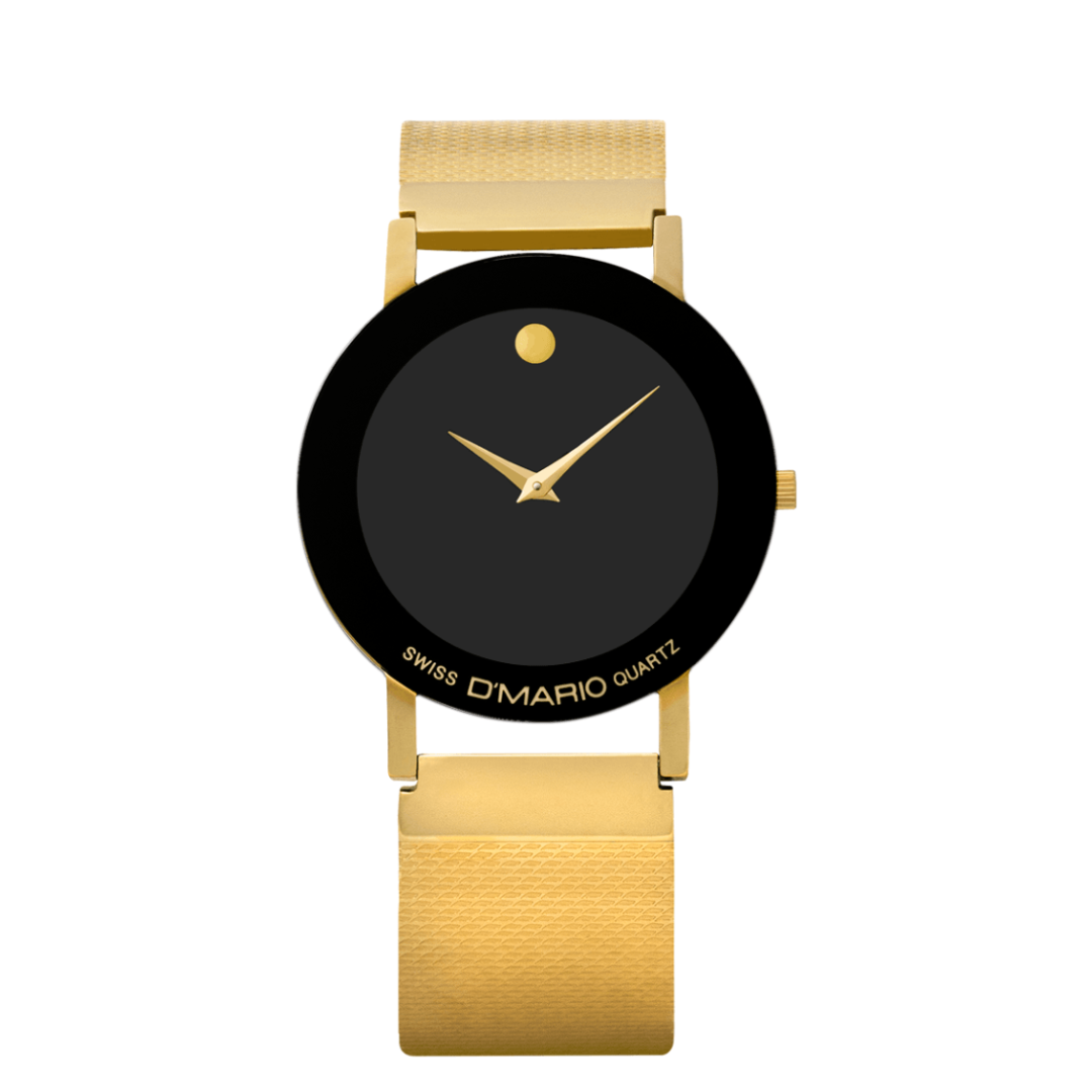 El D’Mario ZE1150 es un reloj de pulsera que encarna la elegancia clásica y la precisión suiza, diseñado para el hombre moderno. Este modelo presenta una construcción en acero inoxidable con un suntuoso acabado en tono dorado. Su esfera negra minimalista, protegida por un cristal de zafiro prácticamente inrayable, presenta un diseño limpio con índices de barra. Equipado con un preciso mecanismo suizo, es un accesorio atemporal de perfil delgado, ideal para quienes buscan distinción y durabilidad en un reloj para uso diario o formal.