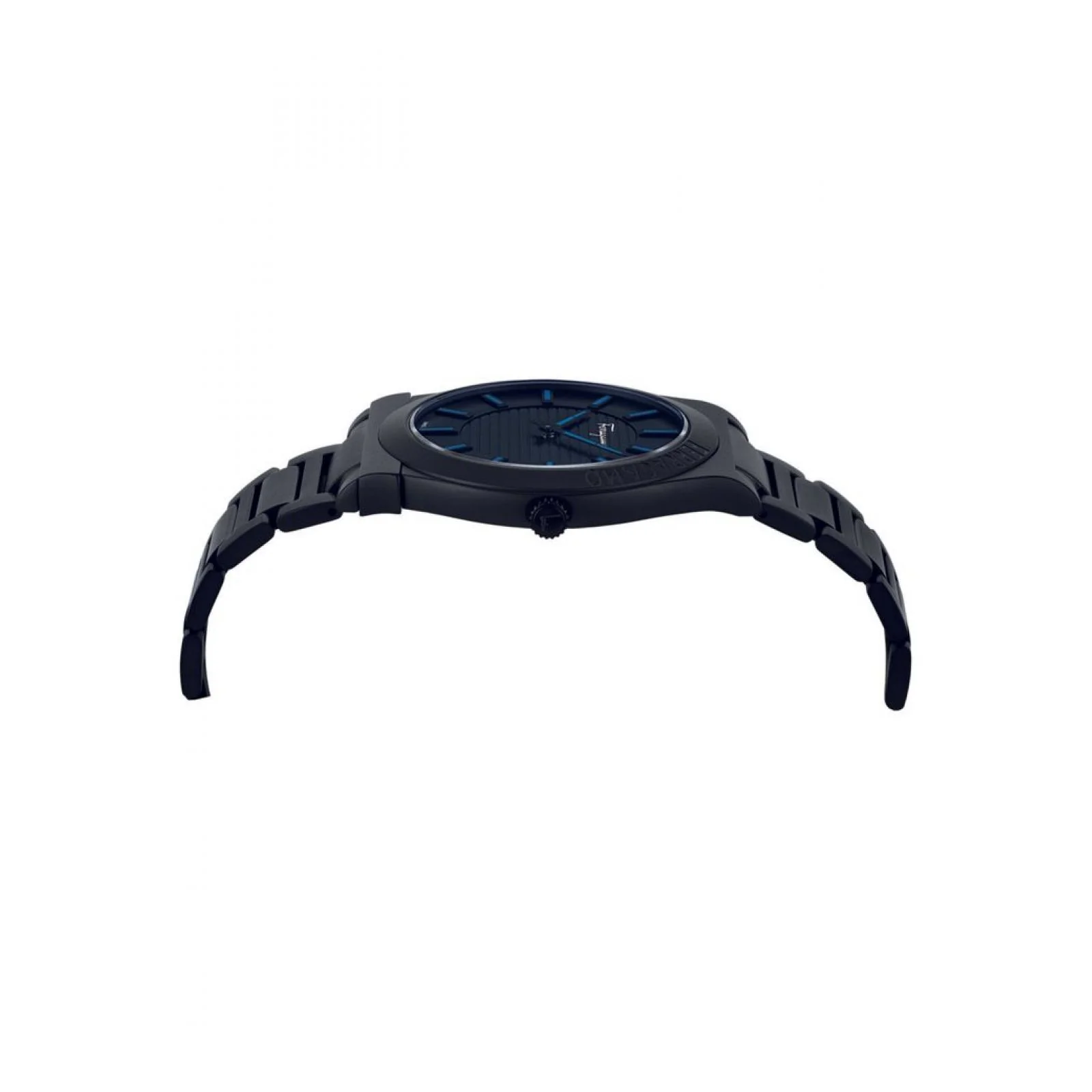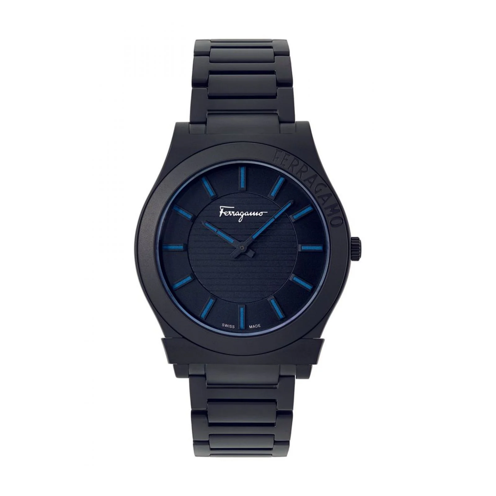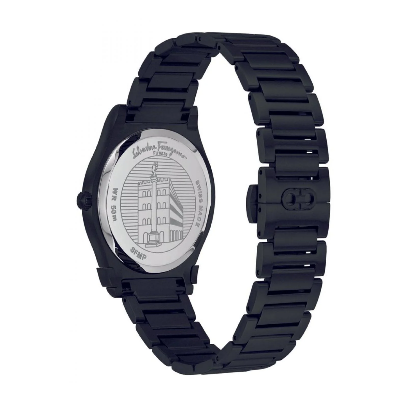 El Salvatore Ferragamo SFMP00622 pertenece a la colección Gancini Gent, una línea que destaca por su minimalismo moderno y la icónica forma de la caja inspirada en el logo Gancini de la marca. Este modelo se presenta en un acabado monocromático negro, con caja y brazalete de acero inoxidable con revestimiento de iones (IP) negro. La esfera negra, que presenta una zona central texturizada, cuenta con manecillas e índices luminosos azules para una legibilidad sofisticada. Impulsado por un movimiento de cuarzo suizo, este reloj es una pieza de lujo discreto, versátil para el día a día o eventos formales.
