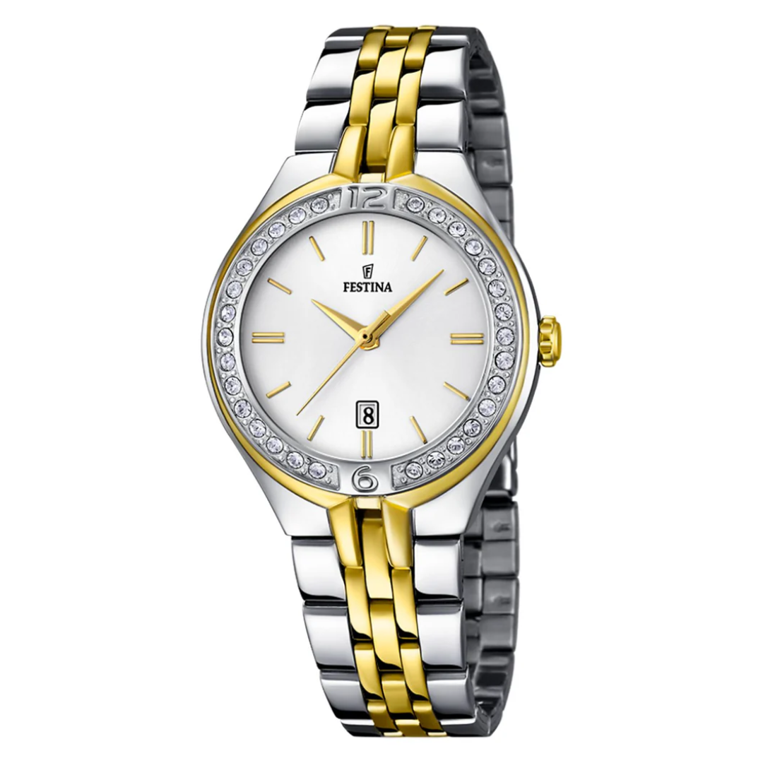 El Festina F16868/1 es un exponente de la elegancia clásica dentro de la colección Mademoiselle, destacando por su acabado monocromático en acero inoxidable de alto brillo. Este modelo se caracteriza por un bisel engastado con circonitas que enmarcan una esfera plateada con acabado “sunray”, la cual refleja la luz de manera sofisticada. A diferencia de las versiones bicolor, este diseño totalmente plateado ofrece una estética atemporal y pulcra, ideal para mujeres que buscan un accesorio refinado que combine la funcionalidad de un calendario con el brillo de una pieza de alta joyería.
