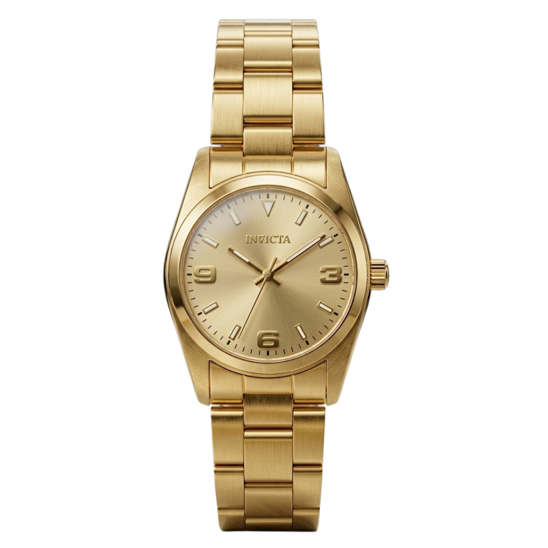 El Invicta 69182 pertenece a la mística colección Celestial, una línea diseñada para capturar la belleza del cosmos en una pieza de joyería funcional. Este modelo destaca por su refinada caja de acero inoxidable con un acabado en tono oro de 18k, que enmarca una esfera dorada con detalles que evocan elementos astronómicos. Su diseño compacto de 28 mm y su cristal Flame Fusion —una fusión patentada por Invicta que combina la resistencia a impactos del cristal mineral con la dureza del zafiro— lo convierten en un accesorio elegante pero duradero para el uso diario.