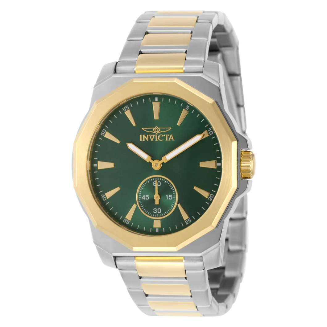 El Invicta 49330 es un reloj de pulsera de la colección Speedway que combina un estilo deportivo con un toque de elegancia bicolor. Este modelo presenta una caja de acero inoxidable de 42 mm con tonos plateados y detalles en oro, que enmarcan una llamativa esfera verde. El diseño versátil se completa con un brazalete de acero inoxidable de dos tonos y un cristal mineral resistente a los arañazos, ofreciendo un accesorio funcional y llamativo para el uso diario con una resistencia al agua básica de 30 metros.