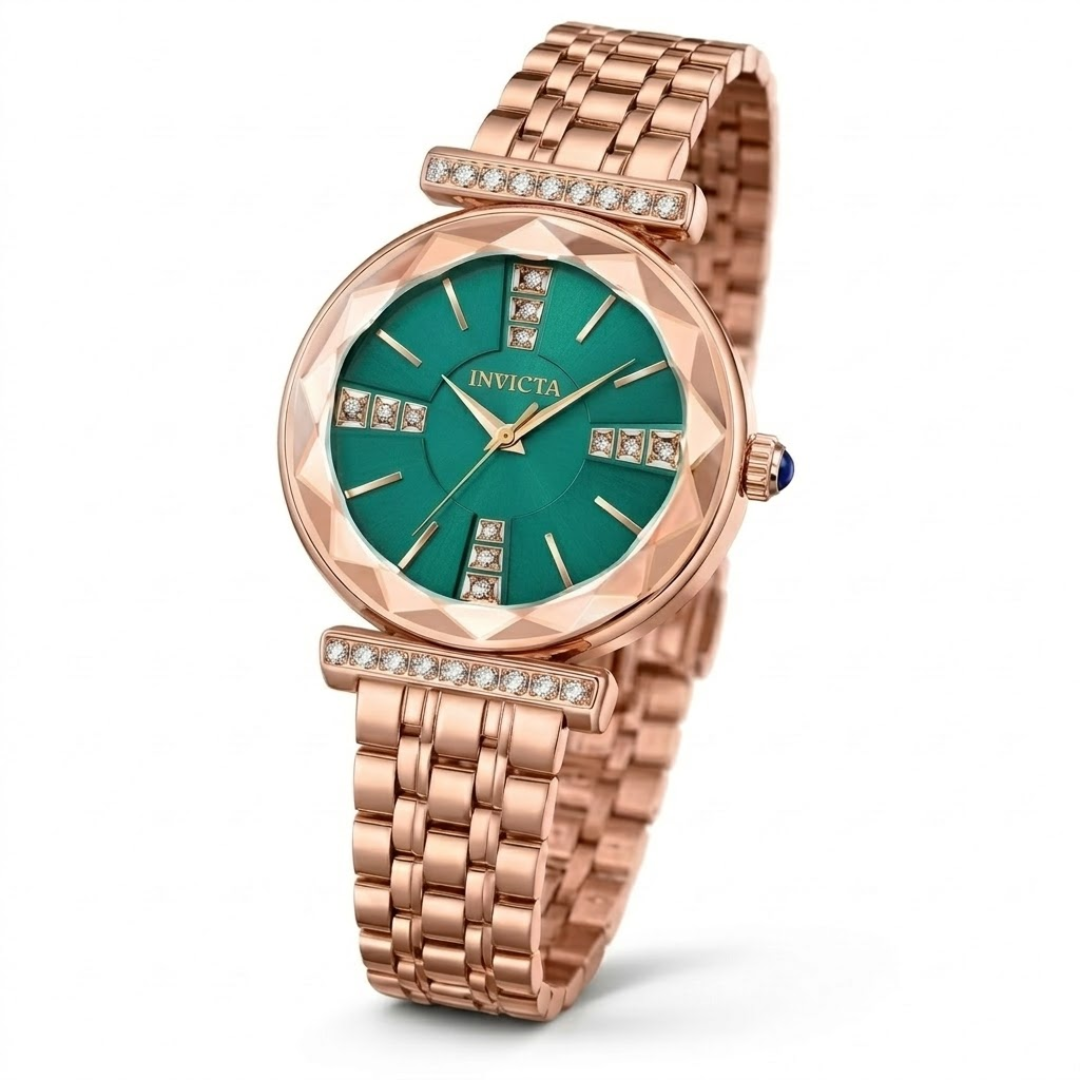 El Invicta 69418 pertenece a la delicada y femenina colección Wildflower, una línea diseñada para capturar la paradoja de la elegancia y la fuerza natural. Este modelo destaca por su refinada caja de acero inoxidable con un acabado en oro rosa de 18k, que enmarca una esfera texturizada en un tono verde cobre único. Su diseño compacto de 30 mm es ideal para la mujer que busca una pieza que combine sofisticación con un toque de color distintivo. Equipado con el cristal Flame Fusion patentado por la marca, este reloj ofrece una protección superior contra impactos y rayaduras, manteniendo su belleza intacta a lo largo del tiempo.