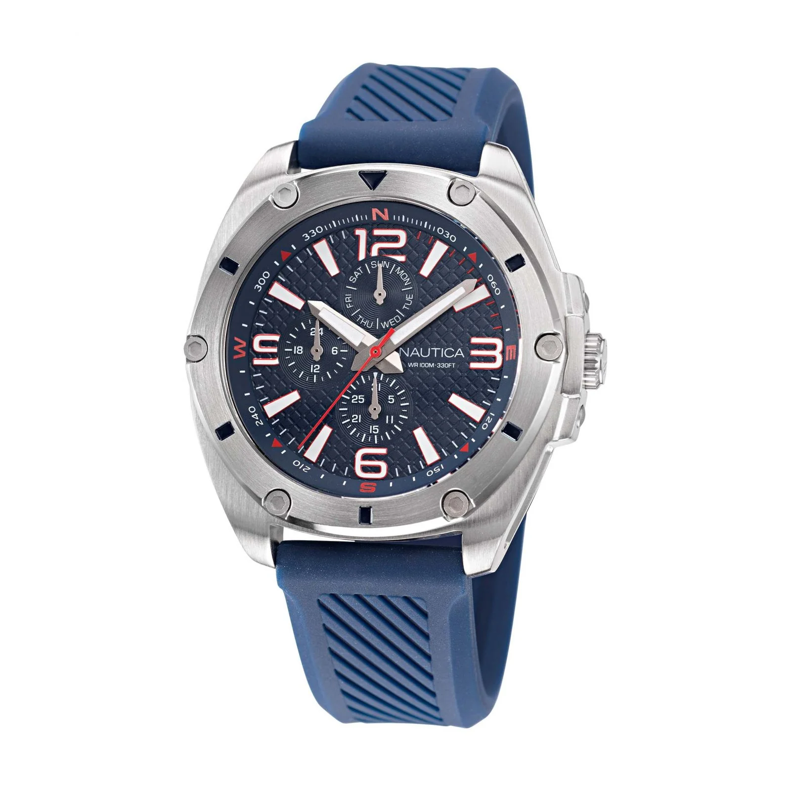 El Nautica NAPTCS224 (colección Tin Can Bay) es un reloj masculino que fusiona la elegancia náutica con la funcionalidad deportiva. Presenta una robusta caja de acero inoxidable plateada y una cómoda correa de silicona azul. Su esfera azul profunda, protegida por un cristal mineral, incorpora subesferas indicadoras del día de la semana, la fecha y el formato de 24 horas. Es un accesorio versátil y llamativo, ideal para el uso diario o actividades acuáticas, gracias a su resistencia de 100 metros.