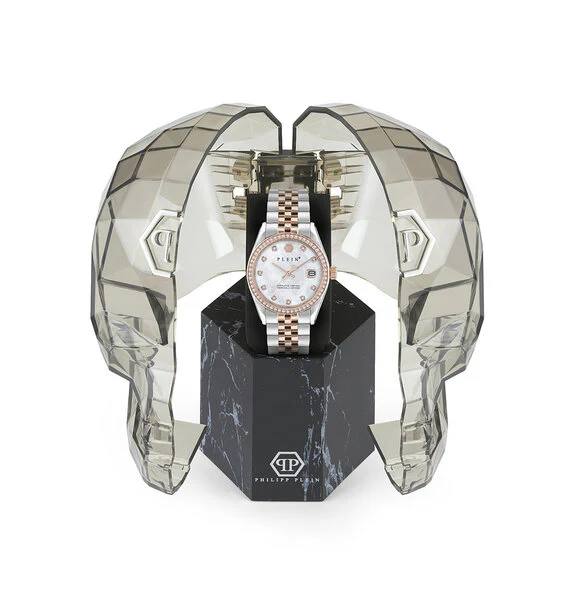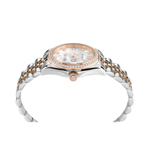 El Philipp Plein PWYAA0223, parte de la colección Street Couture, es un reloj de pulsera que equilibra la elegancia de la alta moda con una funcionalidad sutil. Este modelo presenta una caja y un brazalete de acero inoxidable en un sofisticado diseño bicolor, combinando tonos plateados y oro rosa. Su esfera blanca de nácar (madreperla), un detalle de lujo por primera vez en esta colección según WatchXL, está adornada con cristales brillantes y ofrece una visualización de fecha integrada. Es un accesorio versátil, ideal para añadir un brillo sutil a cualquier atuendo diario o de ocasión especial.