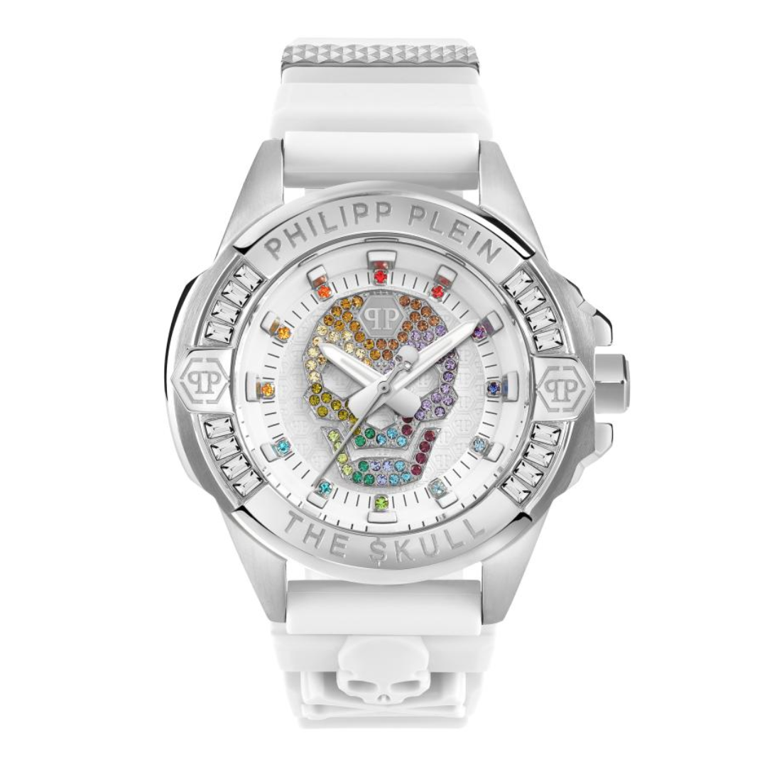 El Philipp Plein PWNAA1023, de la deslumbrante colección The $keleton Crystal Pave, es una pieza de alta joyería que redefine el concepto de reloj femenino de lujo. Este modelo presenta una caja de acero inoxidable en tono plateado completamente pavonada con cristales brillantes. La característica principal es su esfera esqueletizada transparente, que permite admirar el movimiento automático interno y está coronada con el emblemático motivo de calavera y tibias cruzadas de la marca. Se complementa con una correa de silicona blanca que equilibra la opulencia del diseño con un toque deportivo y moderno.