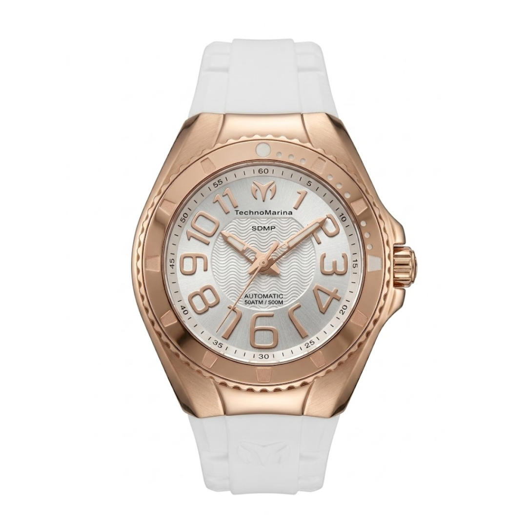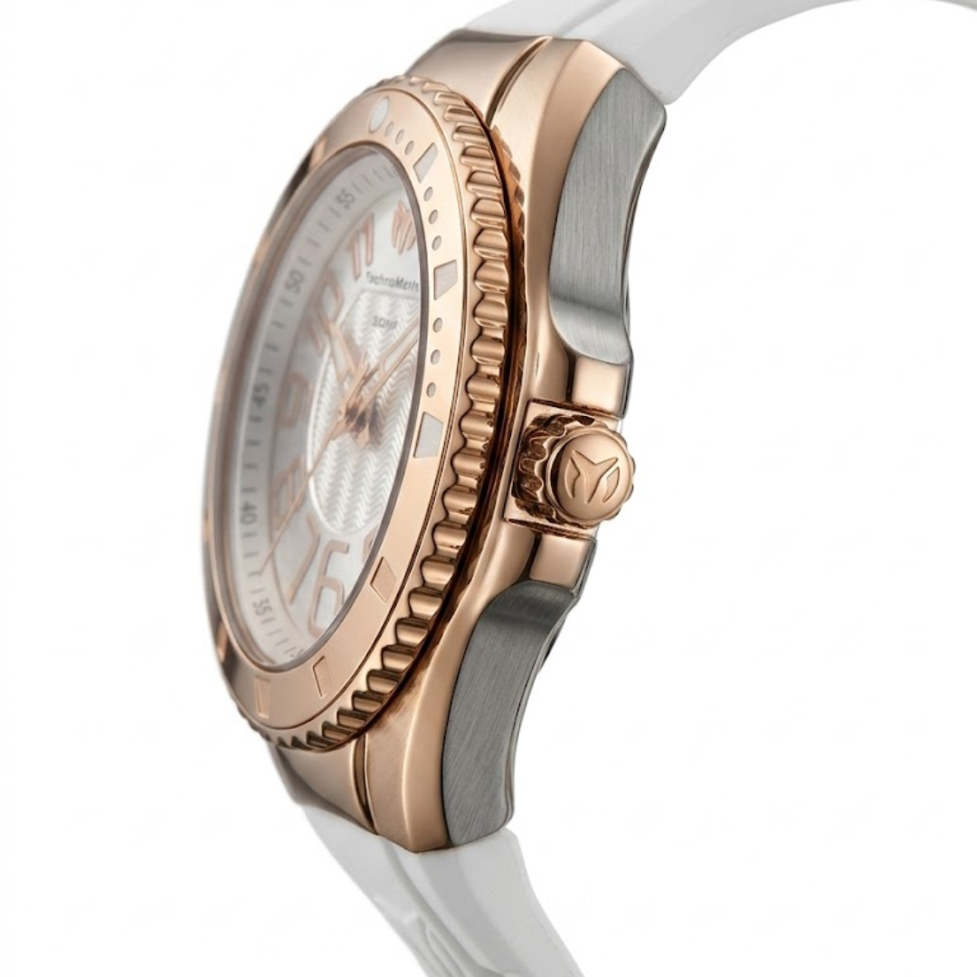 El TechnoMarine TM-225040 pertenece a la sofisticada colección Lusso Mare, una línea que fusiona la elegancia náutica con un diseño contemporáneo y versátil. Este modelo destaca por su luminosa estética en color blanco, acentuada por un bisel y detalles en tono oro rosa que aportan un toque de lujo sutil. Diseñado para quienes buscan un accesorio que transite sin esfuerzo entre el estilo deportivo y el casual elegante, cuenta con una correa de silicona de alta resistencia y una caja de acero inoxidable que garantiza durabilidad tanto en tierra como en actividades acuáticas moderadas.