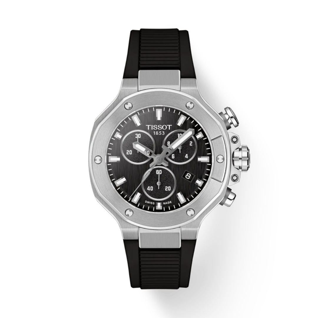 El Tissot T141.427.27.041.00 es la pieza maestra de la colección 2026, una edición limitada a solo 2,026 unidades que celebra la cúspide del motociclismo mundial. Este cronógrafo automático destaca por su imponente diseño técnico, con un bisel que incorpora un anillo de carbono forjado y una estructura que emula las piezas de alto rendimiento de una moto de competición. Su esfera azul profundo con acabados cepillados protege un motor suizo de élite, el calibre Valjoux A05.231, cuya masa oscilante en forma de llanta es visible a través del fondo transparente. Presentado en un estuche especial con forma de casco, es el santo grial para los coleccionistas que buscan la unión perfecta entre la alta relojería mecánica y la adrenalina de MotoGP™.