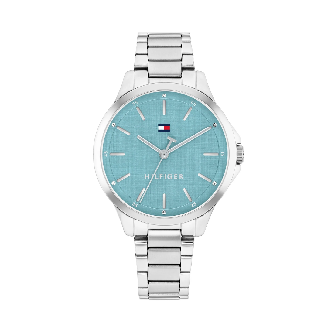 El Tommy Hilfiger 1782826 es una pieza esencial de la colección Chloe, diseñada para la mujer que busca un accesorio que combine la sofisticación clásica con un toque moderno y deportivo. Este modelo destaca por su elegante caja de acero inoxidable de 34 mm y una llamativa esfera en color azul claro con acabado sunray y una sutil textura de lino. Detalles refinados como los índices tipo barra y delicados cristales incrustados aportan un brillo sutil, mientras que su brazalete de eslabones integrados en acero plateado garantiza una estética pulida y versátil. Es el complemento ideal para elevar cualquier conjunto diario, ofreciendo un equilibrio perfecto entre funcionalidad técnica y estilo contemporáneo.