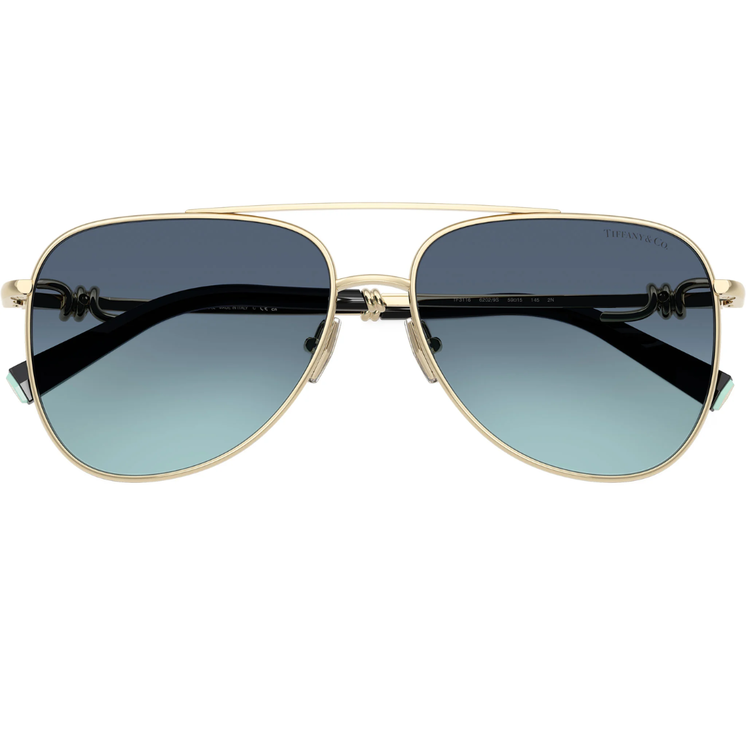 Gafas de sol de estilo piloto (aviador) contemporáneo con un diseño de montura completa en metal plateado mate. Este modelo de lujo se complementa con micas azul claro degradado, ofreciendo un accesorio sofisticado y femenino que garantiza una visión cómoda en condiciones de luminosidad media.