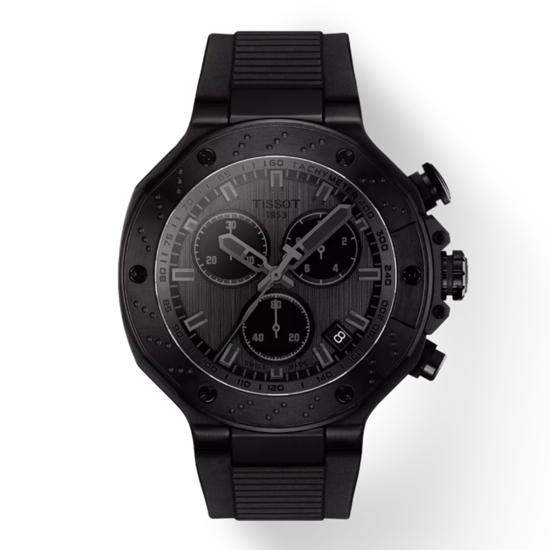 El Tissot T141.417.37.061.00 es una pieza de alto impacto que fusiona la agresividad del motociclismo de competición con una estética táctica y moderna. Este cronógrafo de la colección T-Race destaca por su caja de acero inoxidable con revestimiento PVD negro, que resalta los icónicos detalles de la línea: un bisel inspirado en un disco de freno y pulsadores que emulan los estribos de una moto. Su esfera de color antracita con acabado cepillado ofrece un aspecto industrial y sofisticado, mientras que la correa de silicona negra garantiza una ergonomía superior. Es el reloj definitivo para quienes buscan un accesorio con carácter fuerte, durabilidad extrema y la precisión de la ingeniería suiza.