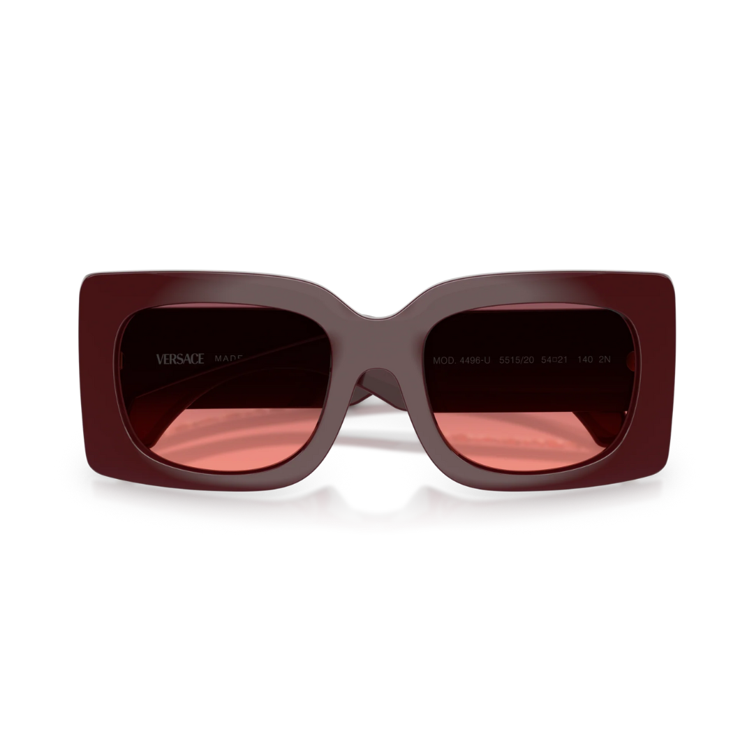 Gafas de sol de estilo cuadrado con un diseño moderno, destacando una montura de acetato en un elegante color violeta transparente. Este modelo de lujo de Versace se complementa con micas plateadas con un intenso efecto espejo, ofreciendo un accesorio de alta costura que garantiza un estilo distintivo y una visión cómoda en condiciones de luminosidad media, con el icónico emblema de Medusa en las patillas.