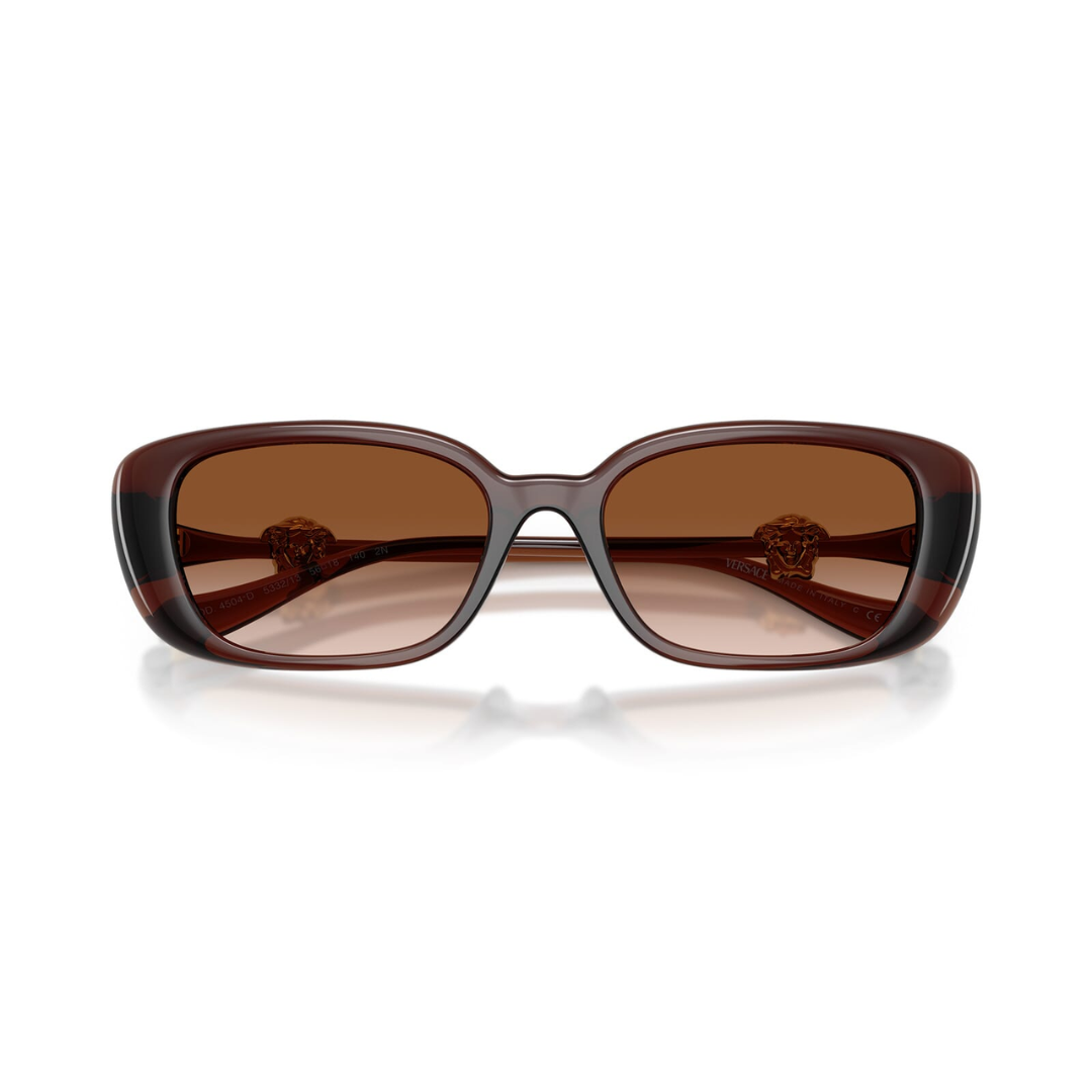 Gafas de sol de estilo cuadrado de gran tamaño, con un diseño moderno y una montura de acetato en un tono marrón habana (carey) oscuro. Este modelo de lujo de Versace se complementa con micas en un tono marrón degradado, ofreciendo un accesorio de alta costura que garantiza un estilo distintivo y una visión cómoda en condiciones de luminosidad media, con el icónico emblema de Medusa en las patillas.