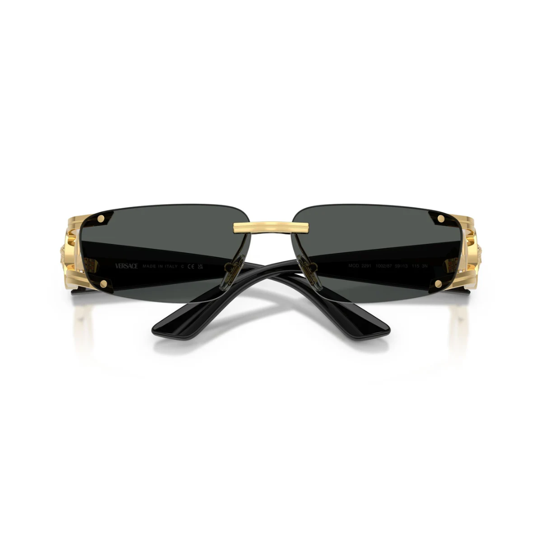 Gafas de sol de estilo aviador con un diseño moderno y minimalista, destacando una montura metálica en tono dorado brillante. Este modelo de lujo de Versace se complementa con micas grises oscuras, ofreciendo un accesorio de alta costura que garantiza un estilo distintivo y una visión cómoda en condiciones de luminosidad alta.