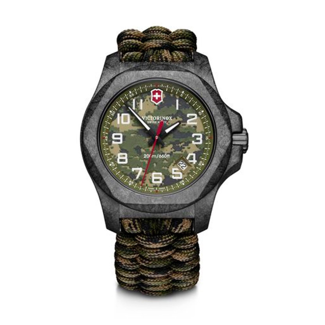 El Victorinox 241927.1 es una edición limitada del I.N.O.X. Carbon, conocida como la “Military Limited Edition”. Destaca por su caja de compuesto de carbono ultraligero y extremadamente resistente a los arañazos, material utilizado en transbordadores espaciales. Su esfera es de color verde camuflaje luminiscente, que brilla en la oscuridad revelando el patrón. Viene con una correa de paracord verde militar y un parachoques de brújula protector, además de incluir correas adicionales y, en algunos sets, una navaja Evolution 23. Es un reloj suizo de supervivencia sometido a 130 pruebas extremas, diseñado para la máxima durabilidad.