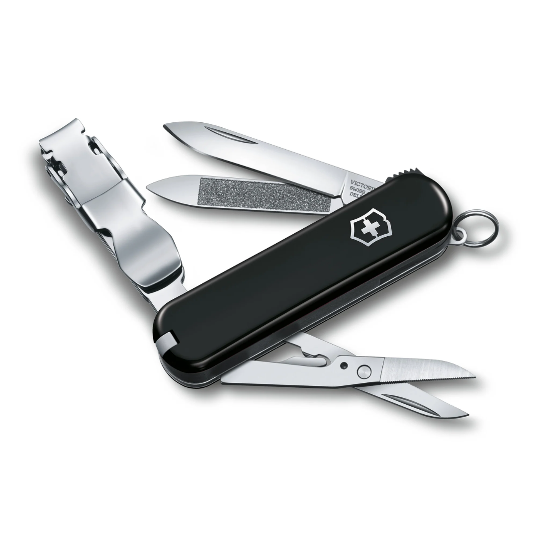 | Funciones principales (8 funciones) | Cortaúñas, hoja pequeña, tijeras con filo dentado, lima de uñas, limpiauñas, pinzas, palillo de dientes y anilla. |