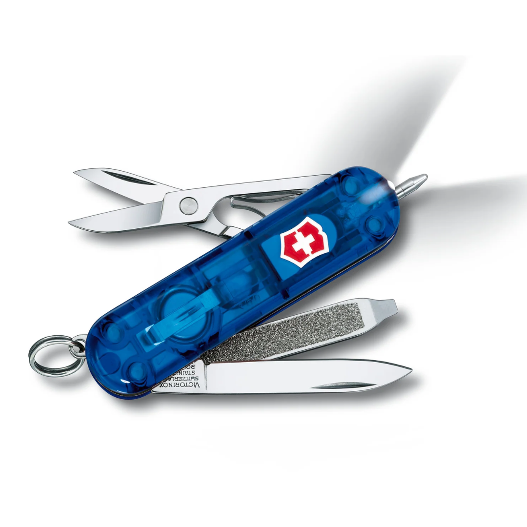 | Funciones principales (8 funciones) | Hoja pequeña, tijeras, lima de uñas, destornillador 2.5 mm, bolígrafo de presión, pinzas, palillo de dientes y anilla. |