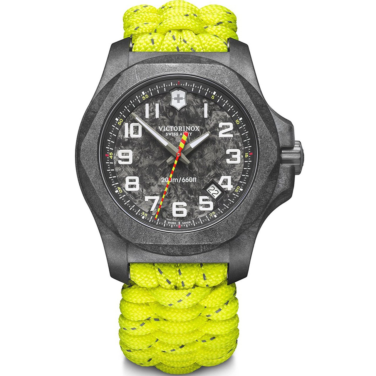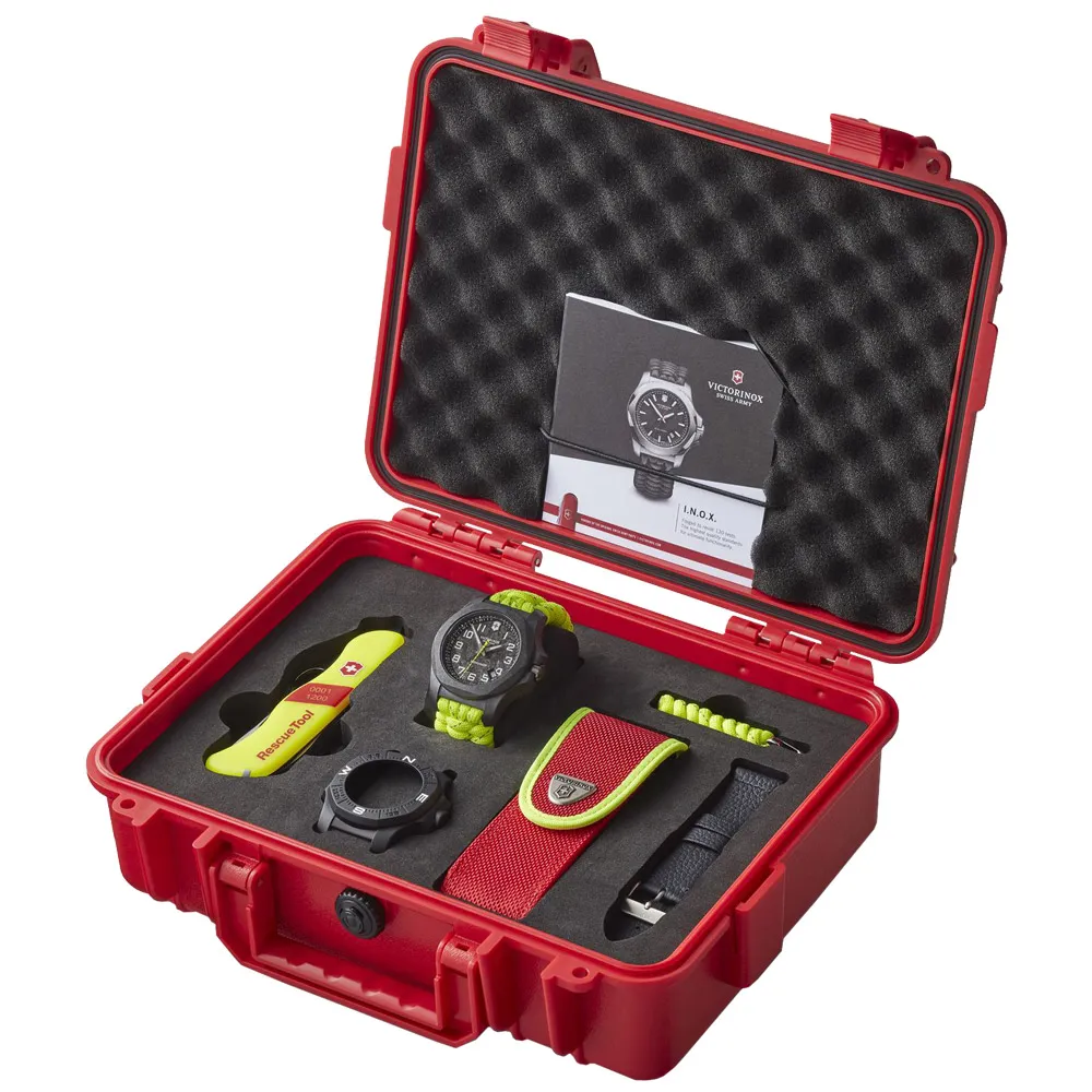 El Victorinox 241858.1 es una edición limitada de solo 1,200 unidades a nivel mundial, diseñada para rendir homenaje a la labor de los bomberos y equipos de rescate. Su caja está fabricada con un compuesto de carbono extremadamente resistente, un material utilizado para proteger transbordadores espaciales de temperaturas extremas. Este modelo destaca por su correa de paracord amarillo neón con hilos reflectantes y un segundero decorado con el motivo “chevron” de los servicios de emergencia. Se entrega en un estuche especial que incluye una herramienta de rescate (Rescue Tool) exclusiva de la marca y una correa de cuero negro adicional.